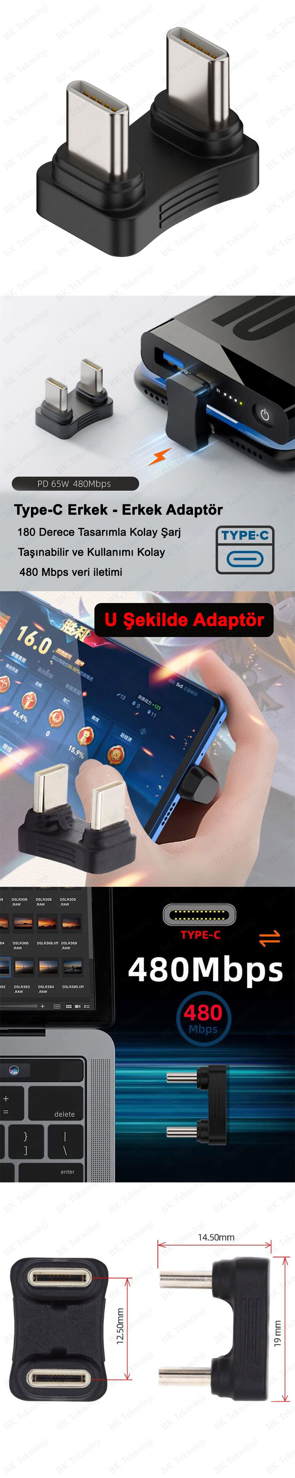 U şeklindeki güç şarj adaptörüne sahip Type-C erkek - Type-C erkek konnektör, PD şarjını ve 480 Mbps veri iletimini destekler. Type-C cihazlar, mobil cihazlar, dizüstü bilgisayarlar ve diğer cihazlarla uyumludur.
