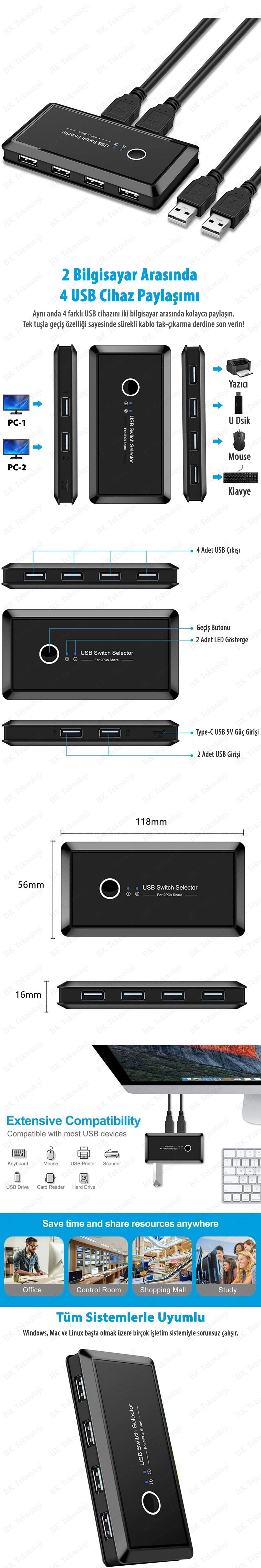 2 Bilgisayar Arasında 4 USB Cihaz Paylaşım Anahtarı (USB Kvm Switch)