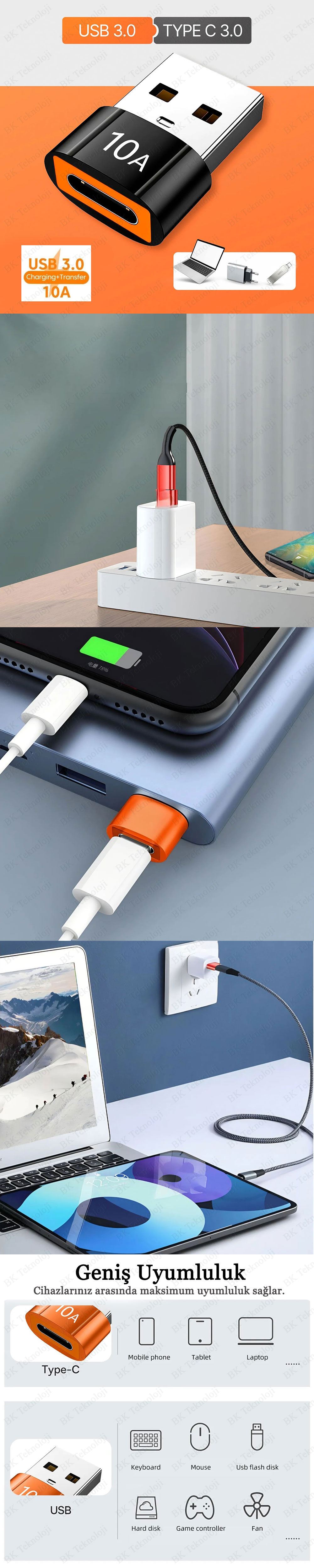 USB 3.0 Type-C Çevirici Adaptör 10A Hızlı Şarj 10Gbps Dönüştürücü